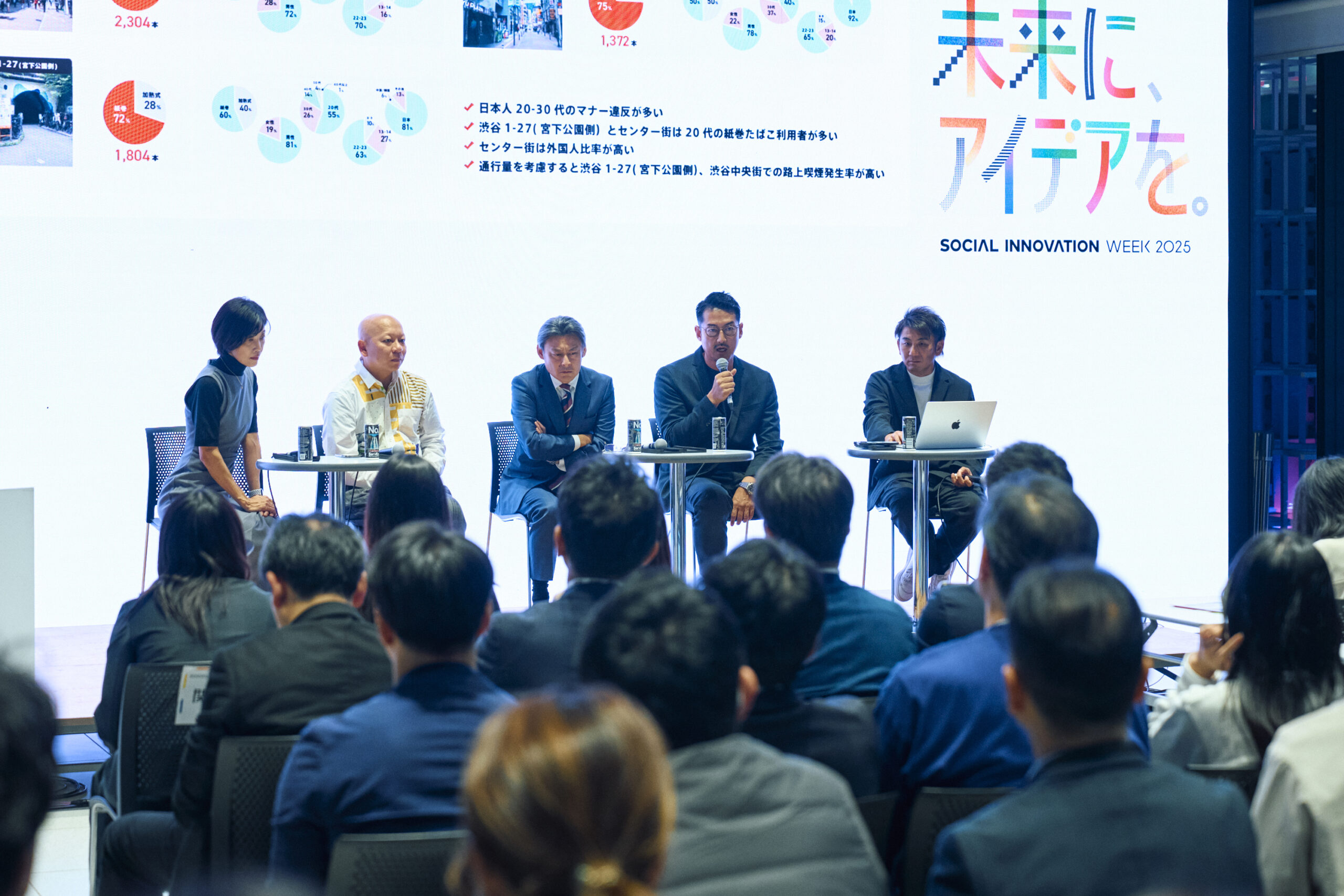 「ACTION for 0 始動!! 〜新しい都市インフラ『GOOD MANNER SPOT』の可能性〜」では、渋谷区副区長の杉浦小枝さん、東京都市大学の中島伸さん、明治通り宮下パーク商店会の百瀬義貴さん、フィリップモリスジャパンの鶴岡斉さん、SIWプロデューサーの金山淳吾が登壇。路上喫煙やゴミのポイ捨てといった都市課題に対し、産官学民が連携して取り組む渋谷グッドマナープロジェクトの一環として始動した「ACTION for 0」についてトークセッションを行いました。