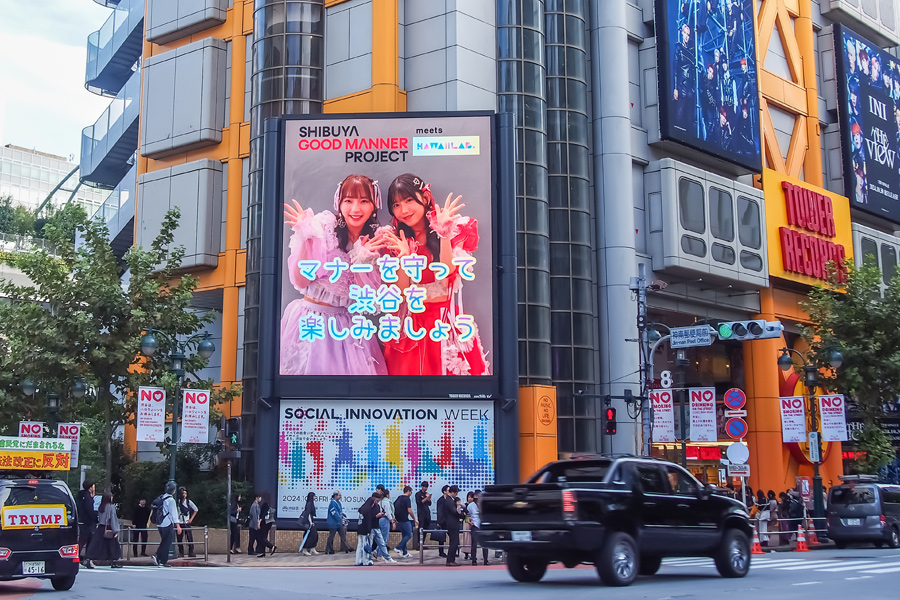 マナー啓発では、渋谷グッドマナープロジェクトアンバサダーの小谷実可子さんと、ハロウィンの啓発活動に賛同したKAWAIILABさんの啓発動画を渋谷駅周辺のビジョンで放映し、マナー啓発を呼びかけました。
